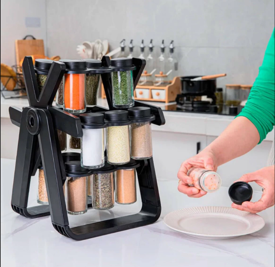 ¡Transforma tu cocina con el Porta Condimentos Giratorio 18 POTES Con diseño moderno, estructura duradera y altísima funcionalidad, tiene capacidad para 18 frascos de vidrio con tapa dosificadora en una base giratoria práctica y elegante. Ideal para quienes valoran la organización, la optimización del espacio y un toque de sofisticación en la encimera.